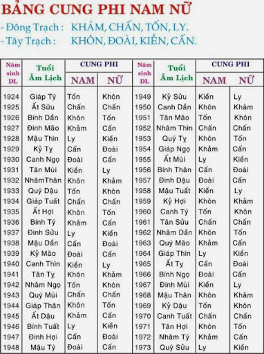 Tính cung Phi tức xem theo 8 cung (xem phụ chú trong blog) :